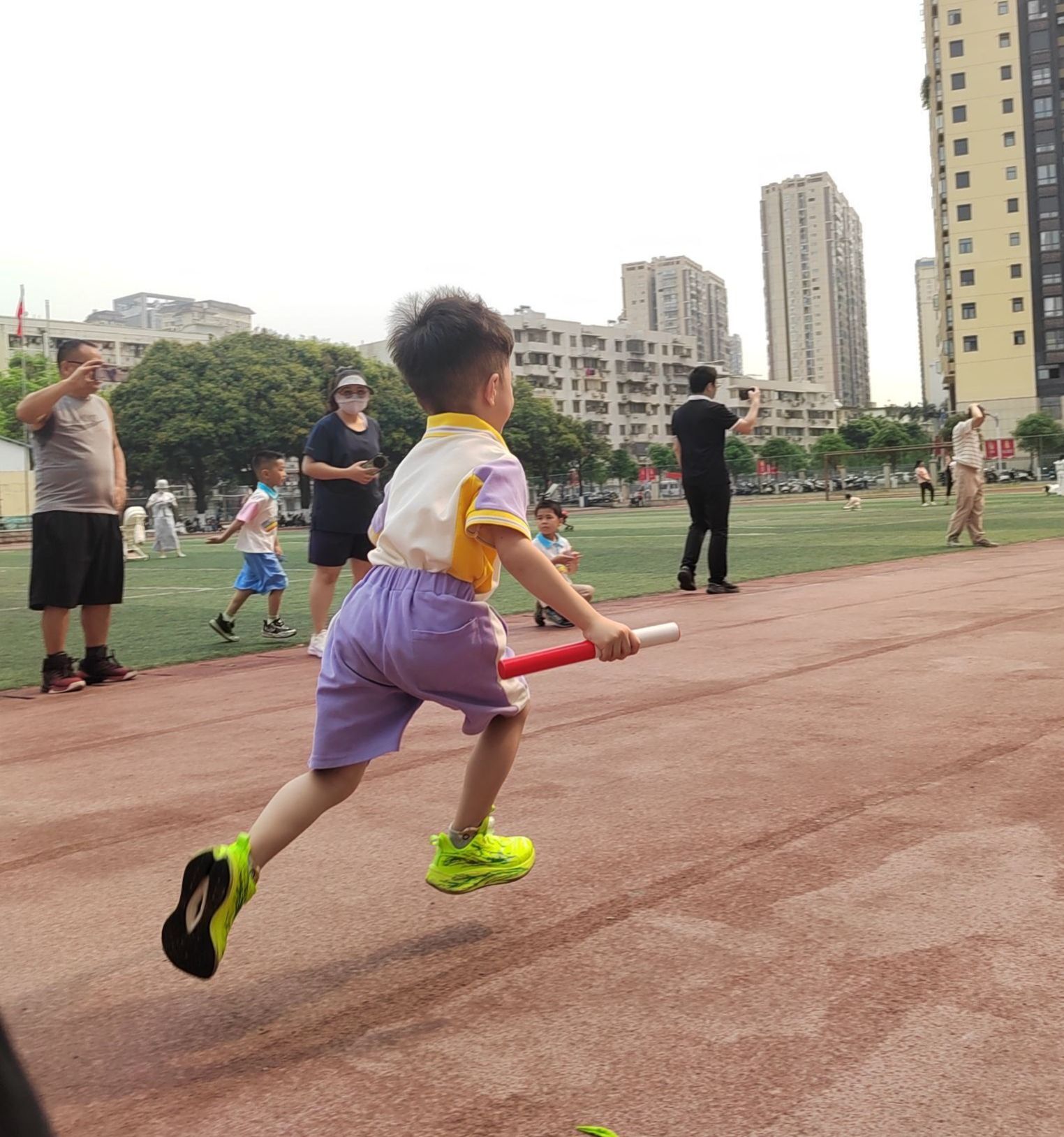 紧张刺激的全园接力跑比赛按照大、中、小班的顺序依次展开。孩子们在跑道上奋力奔跑,接力棒传递的不仅是速度,更是团结与信任。加油声、呐喊声此起彼伏,每一个奋力的瞬间,都定格成了赛场上最动人的画面。